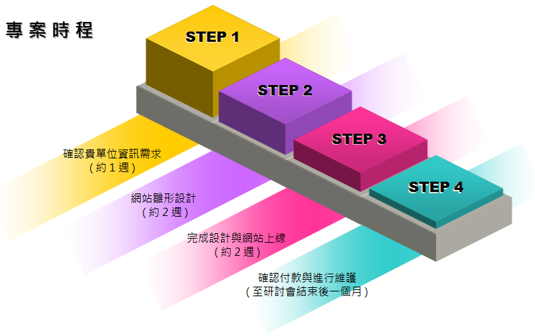| 第一階段 確認貴單位資訊需求 | 您可以填寫功能需求表後,Email給我們,我們將於 1 週內, 主動與您聯繫,並回報系統建置費用。 | 1 週 |