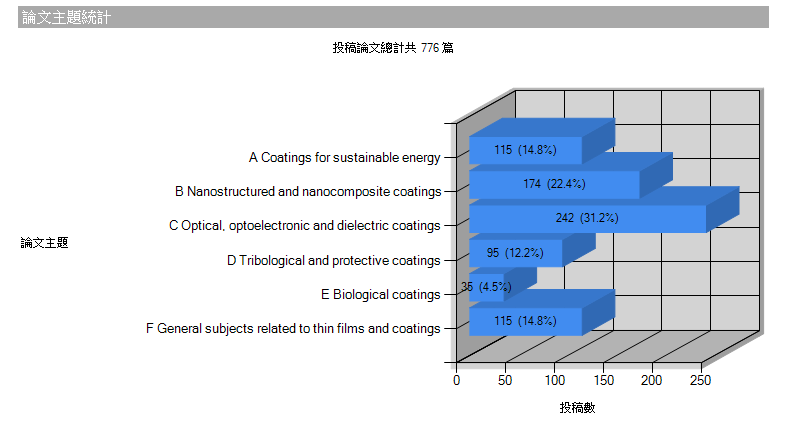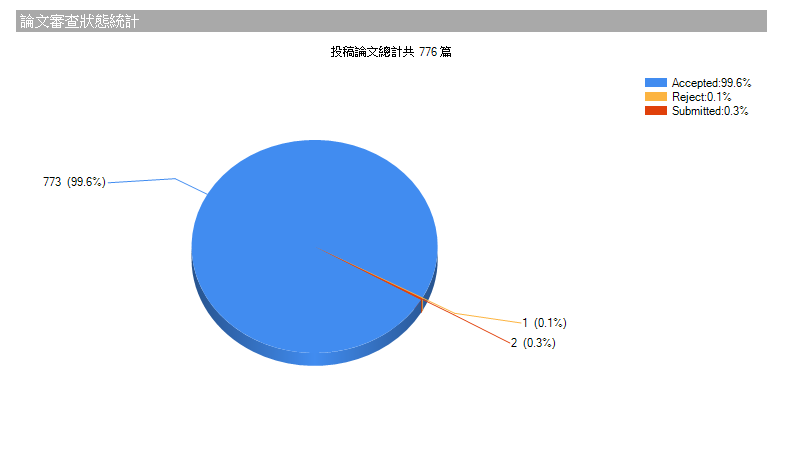 後台詳盡的統計圖表,讓您輕鬆掌握目前研討會狀態,譬如主題投稿篇數統計、論文審查狀態統計、