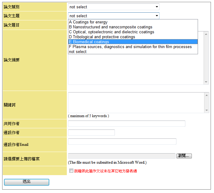 作者登入系統後,會依照後台設定好的論文主題及類別來進行投稿,投稿完成後,