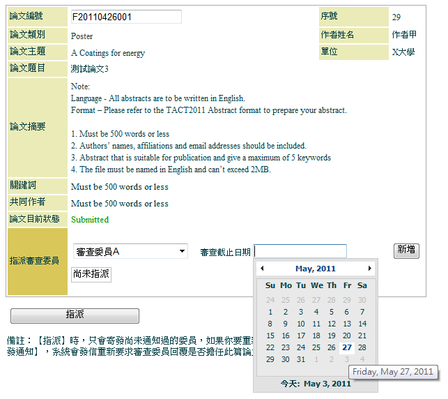 在確認論文的屬性後,便可以開始指派審查委員,本系統支援多審查委員機制,您可以選擇 1 到無限多的審查委員