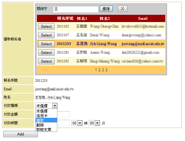 與報名系統結合,選取報名者並填入匯款方式及金額、時間