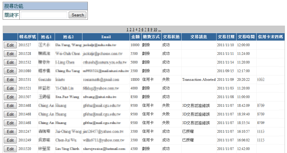 所有的繳費紀錄查詢,其中包含手動輸入以及金流系統自動匯入的刷卡資料,