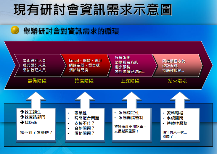 就讓我們來逐步分析一下,如下圖所示,我們將研討會的資訊需求分為四個階段。